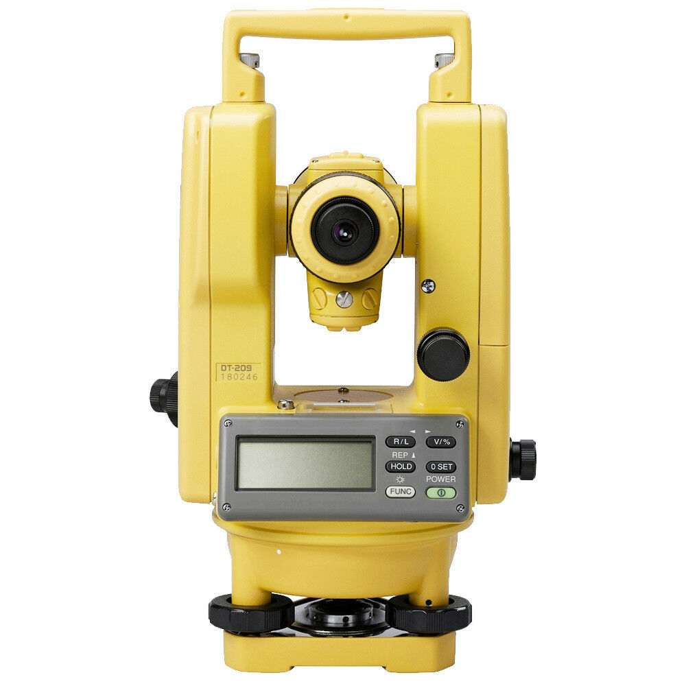 The affordable Topcon DT-209 Digital Theodolite delivers 9" angle accuracy. The Topcon DT-209 Digital Theodolite weathers any wet or dust conditions in the field, allowing for a more productive day during inclement weather. The Topcon DT-209 is also compact and lightweight for easy portability; and its simple operation provides precise measurement in a functional, hassle-free package.